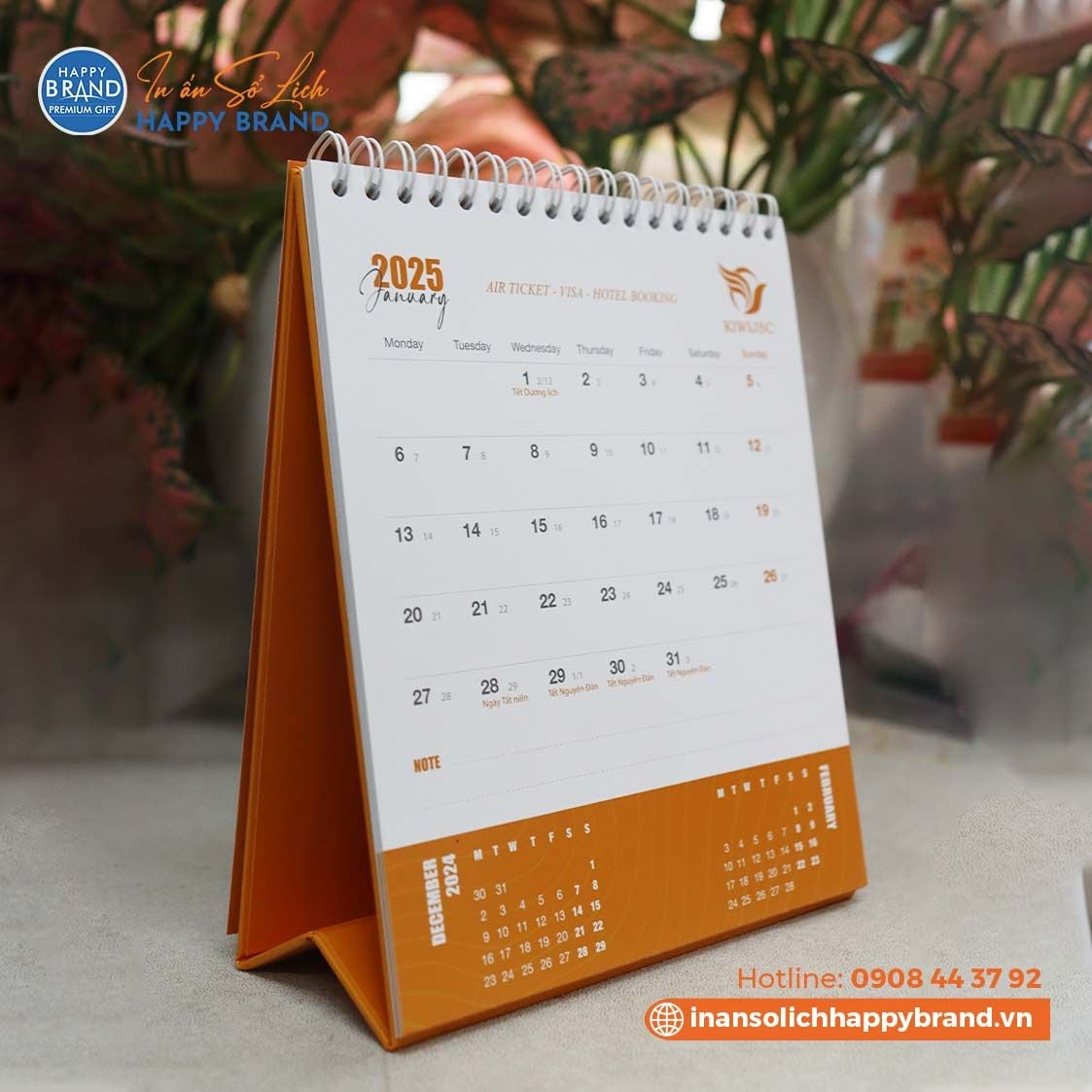 Tư vấn thiết kế lịch tết: Khi đặt in lịch quý khách sẽ được chúng tôi tư vấn về quy cách chất liêu cho từng loại lịch sao cho phù hợp với số lượng in và mục đích sử dụng. Từ đó chúng tôi sẽ lên ý tưởng cho mẫu lịch của quý khách, chuyên viên của chúng tôi sẽ tư vấn để quý khách có được mẫu lịch đẹp và phù hợp nhất. Ngoài ra bạn có thể chọn mẫu lịch tết phù hợp với lĩnh vực ngành nghề kinh doanh trong catalogue mẫu lịch tết của chúng tôi. Báo giá in lịch tết: Sau khi quý khách được tư vấn và lựa chọn được mẫu lịch tết chúng tôi sẽ lên báo giá chi tiết đến quý khách với giá in lịch rẻ nhất theo yêu cầu. Thiết kế Lịch tết: Chúng tôi sẽ thiết kế lịch theo ý tưởng và yêu cầu khi quý khách đặt in lịch tại Happy Brand. Mẫu Lịch tết sẽ được thiết kế mẫu để quý khách xem và chỉnh sửa theo yêu cầu đến khi quý khách thực sự hài lòng. In Lịch tết: Lịch tết được in bằng máy in offset đảm bảo màu sắc và chất lượng lịch. Giấy lịch tết thường được in là giấy Couch từ 300gms đảm bảo chất lượng độ dày cũng như hình ảnh của tờ lịch. Gia công: Lịch tết được gia công theo từng loại lịch như lịch lò xo, lịch để bàn, lịch sổ, lịch quyển... Giao hàng:Chúng tôi sẽ giao hàng miễn phí tận nơi cho tất cả các khách trong quận nội thành Hồ Chí Minh. Đối với khách ở xa chúng tôi sẽ gửi xe khách, khách hàng sẽ trả phí trực tiếp cho nhà xe.