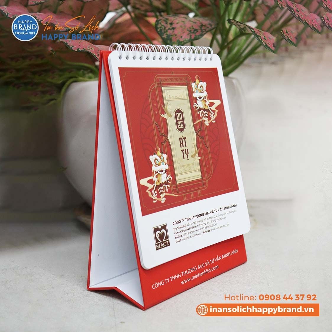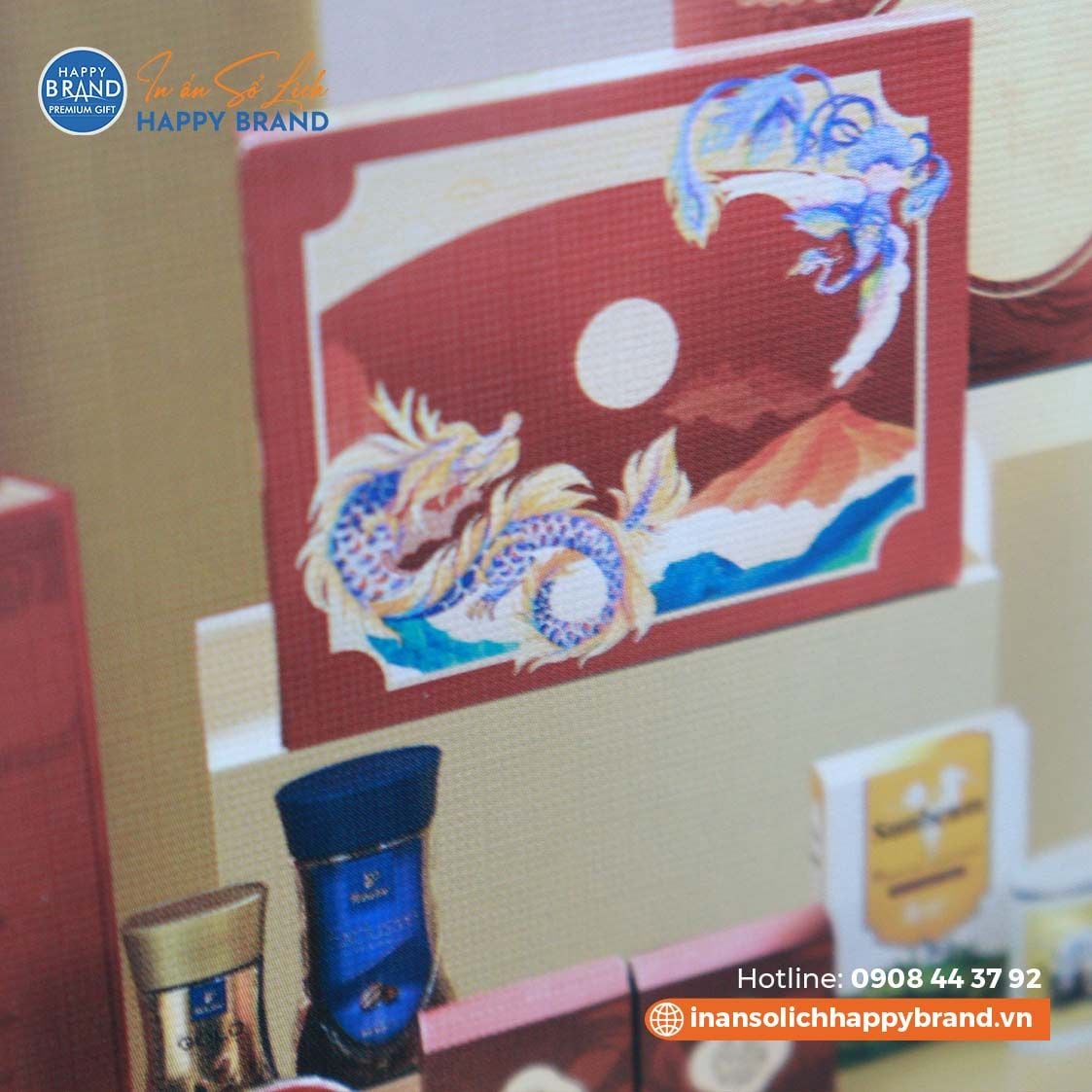 Tư vấn thiết kế lịch tết: Khi đặt in lịch quý khách sẽ được chúng tôi tư vấn về quy cách chất liêu cho từng loại lịch sao cho phù hợp với số lượng in và mục đích sử dụng. Từ đó chúng tôi sẽ lên ý tưởng cho mẫu lịch của quý khách, chuyên viên của chúng tôi sẽ tư vấn để quý khách có được mẫu lịch đẹp và phù hợp nhất. Ngoài ra bạn có thể chọn mẫu lịch tết phù hợp với lĩnh vực ngành nghề kinh doanh trong catalogue mẫu lịch tết của chúng tôi. Báo giá in lịch tết: Sau khi quý khách được tư vấn và lựa chọn được mẫu lịch tết chúng tôi sẽ lên báo giá chi tiết đến quý khách với giá in lịch rẻ nhất theo yêu cầu. Thiết kế Lịch tết: Chúng tôi sẽ thiết kế lịch theo ý tưởng và yêu cầu khi quý khách đặt in lịch tại Happy Brand. Mẫu Lịch tết sẽ được thiết kế mẫu để quý khách xem và chỉnh sửa theo yêu cầu đến khi quý khách thực sự hài lòng. In Lịch tết: Lịch tết được in bằng máy in offset đảm bảo màu sắc và chất lượng lịch. Giấy lịch tết thường được in là giấy Couch từ 300gms đảm bảo chất lượng độ dày cũng như hình ảnh của tờ lịch. Gia công: Lịch tết được gia công theo từng loại lịch như lịch lò xo, lịch để bàn, lịch sổ, lịch quyển... Giao hàng:Chúng tôi sẽ giao hàng miễn phí tận nơi cho tất cả các khách trong quận nội thành Hồ Chí Minh. Đối với khách ở xa chúng tôi sẽ gửi xe khách, khách hàng sẽ trả phí trực tiếp cho nhà xe.